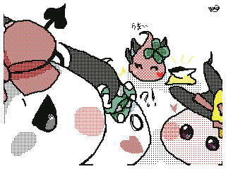 白ドット入りの緑リボンに片方の頬がハートの子:上記の子と双子( 設定 )で、上記の子が食べたお菓子の量に驚いた。