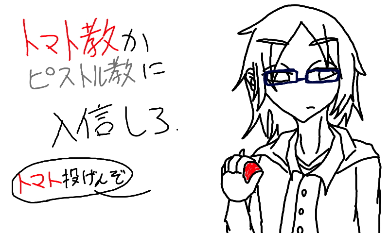 「トマト教かピストル教に入信しろ。でないとトマト投げんぞ」って昨日にぃを脅迫したので((???))