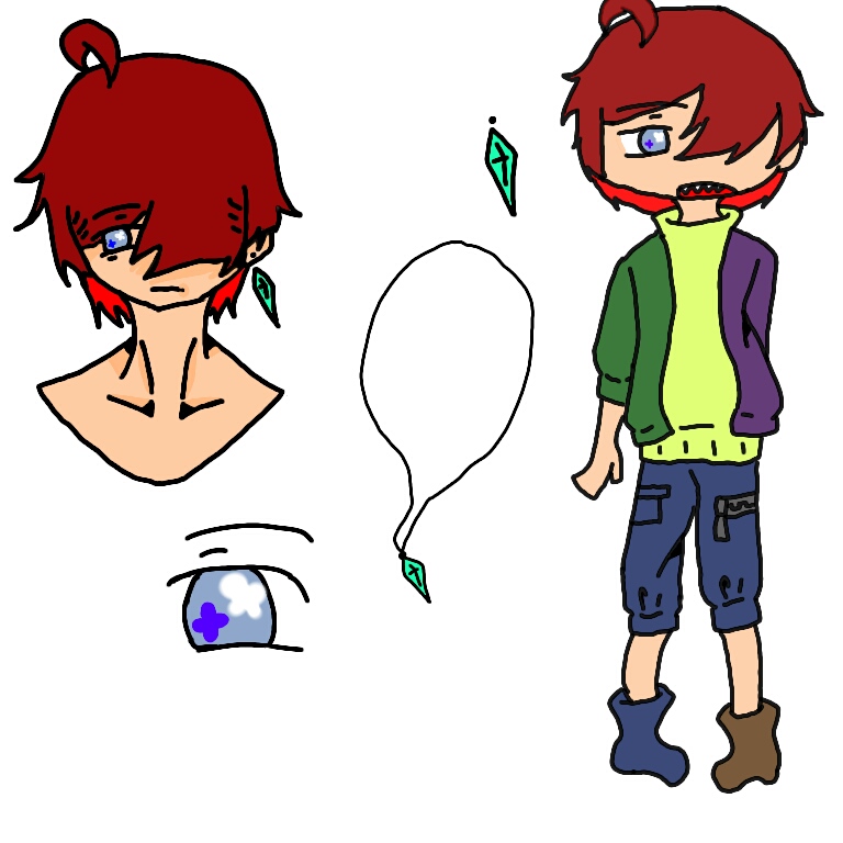少し長い赤色の髪の毛/黄色のニット/左右違う色の上着/ポケットとチャックの付いたズボン/左右違う色のブーツ/