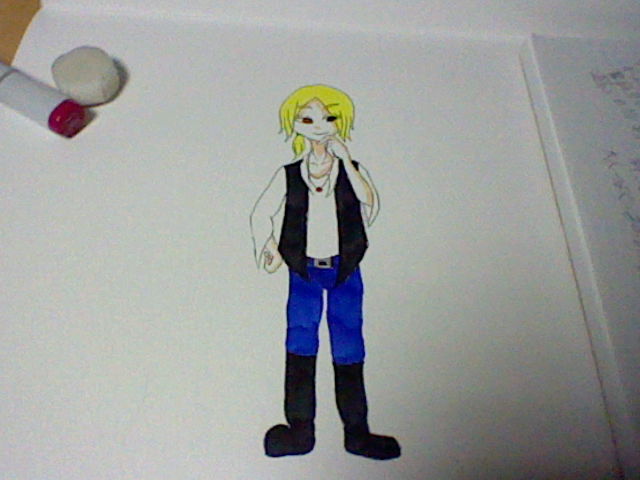 金髪で後ろで結った髪/黒のベストみたいなやつ←/白の七分丈のシャツ/青(紺)のジーンズ/赤のガラス玉のついたネックレス/左手の薬指に指輪