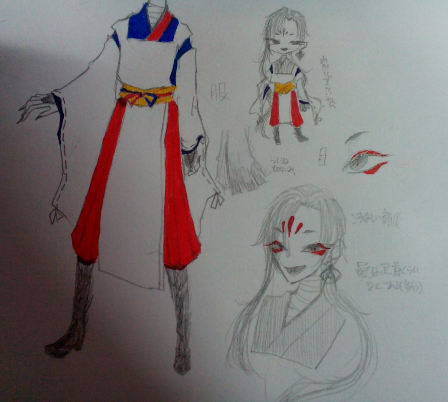 【容姿】身長167cm 体重不明 和装ッッ(( 多分ブーツ、耳飾り、服の後ろに灰→黒グラデーションと切れ込み?、目の周りの紅、額の模様、出したり仕舞ったりできる黒い羽根