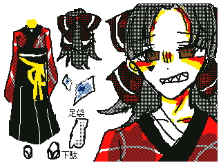 服は赤く、所々赤黒い。波紋のようなものが広まっている模様で、腰辺りに黄色のリボンを巻いている。インナー代わりに包帯を巻いている。後はトプ画の通り。