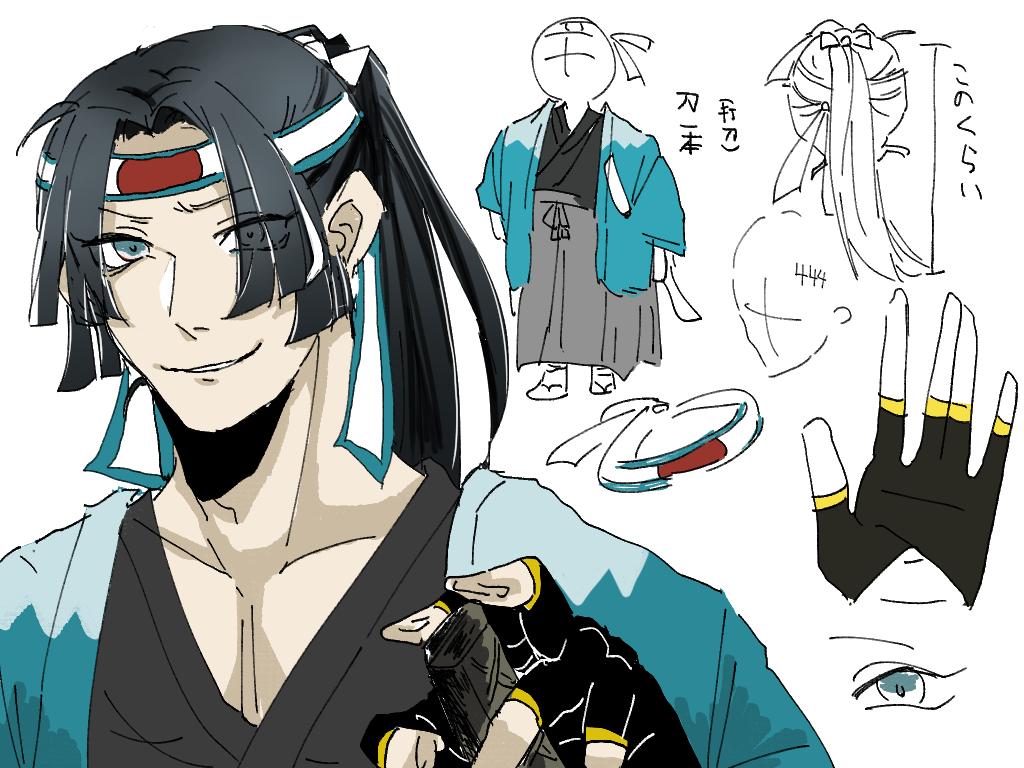髪は縛り 。ハチマキは696の落し物 。政府側の決まり服。目の色はイラスト参照。打刀常備 、乱れ刃 。おでこに番号ハチマキで隠している。