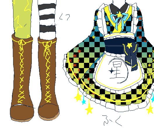 着物とスカートは市松模様に黄色と赤の星みたいのが散らばってます。市松模様の黒じゃない方は淡い緑と青緑のグラデーションになってます。